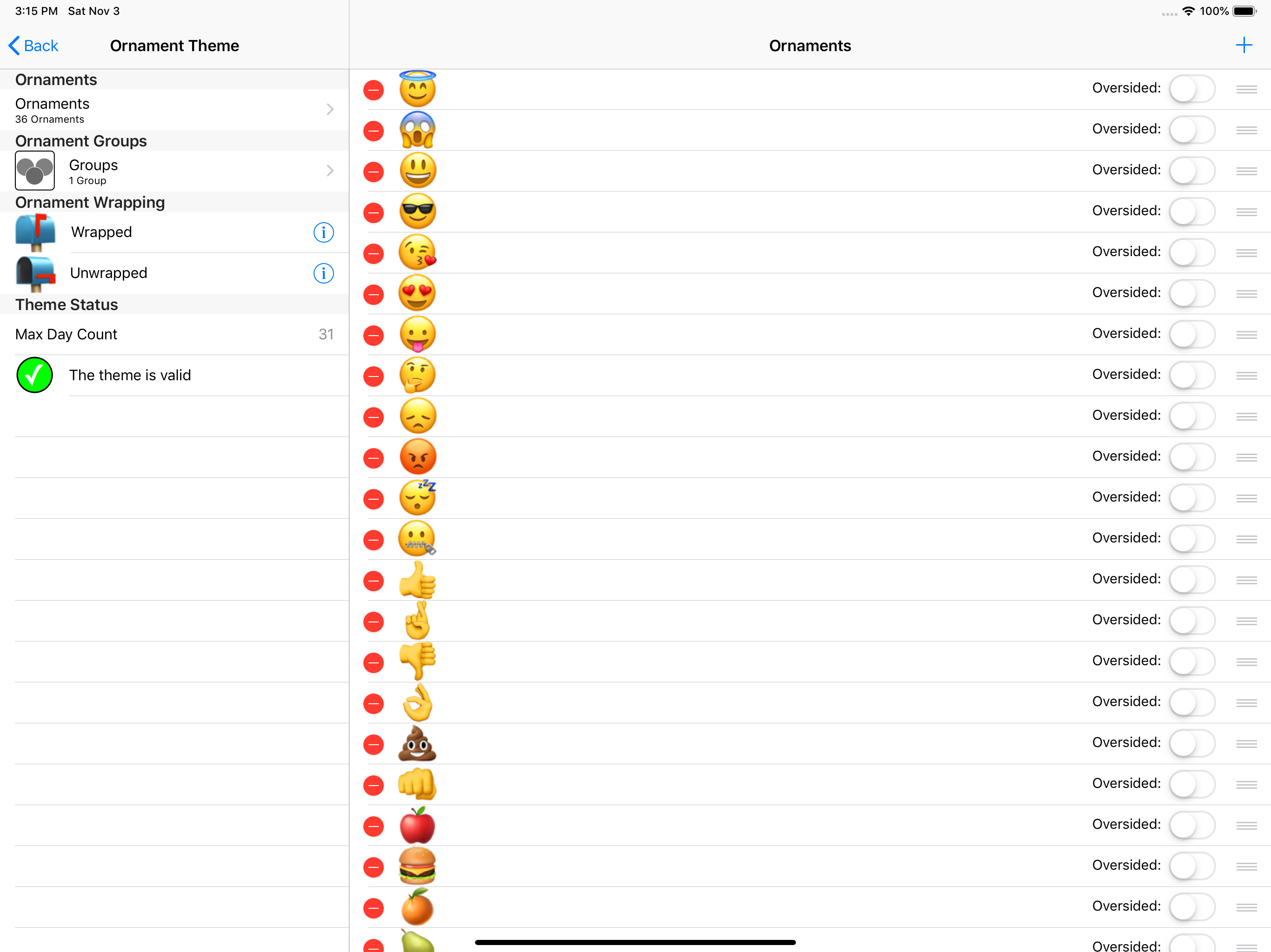 The Plus application provides a built in editor that allows the creation of all four types of themes which make up the Theme Pack. Once the Theme Pack is in a valid state (only one type of theme is required) it can be exported and shared with others. How to get CalAdvent Plus?